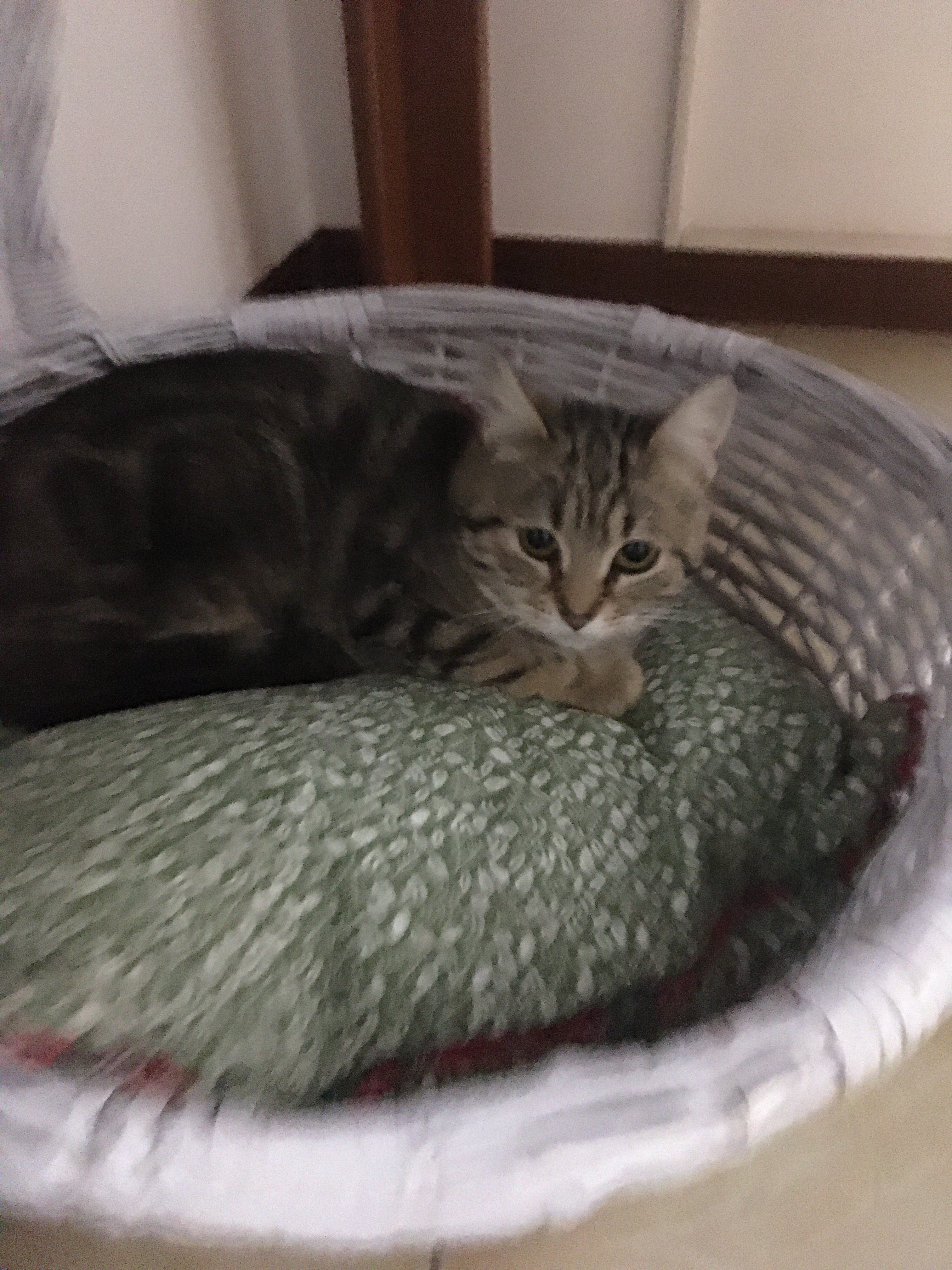 Arriva dal gattile in cui faccio volontariato, è piccola, spaventata: rimane immobile per ore nella lettiera, senza nemmeno provare a uscire. Però ha mangiato dalle mie mani, fa le fusa, si fa mettere nel cesto che dovrebbe farle da cuccia.