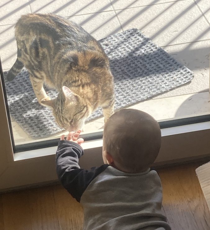 Le sue giornate ora trascorrono nel (vano) tentativo di sfuggire un esserino che vuole toccarla con malagrazia, che più volte al giorno prova a impossessarsi della sua ciotola, che quando la vede ride e produce ultrasuoni. Non c’è nulla, in questo universo, che faccia impazzire Riccardo più della nostra gatta. Proprio per questo, ormai da tempo, ho avviato una ricerca di vestiti e coperte cosparsi di gattini felici. Con mio sommo sgomento però, ho scoperto che non esistono; ed è semplicemente assurdo.